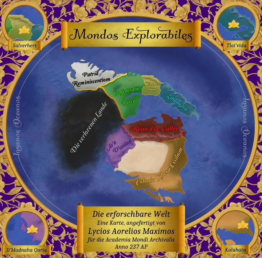Diese Karte zeigt die „Mondos Explorabiles“, sprich die „Erkundbare Welt“ nach Ansichten des großen Reiches Nexos. Sie wurde im Jahr 237 AP (Aeternitas Patriae, bzw. „die Zeit der ewigen Herrschaft Patrias“) fertiggestellt, was fast 70 Jahre vor der Buchreihe ist. Daher können hier alle Länder angesehen werden, bevor sie den Biestern zum Opfer gefallen sind.