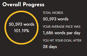 Insgesamt habe ich also knapp 50k Wörter geschafft und bin meinem Ziel (dem Abschluss der finalen Version von CdlR) wieder ein großes Stück näher gekommen! Auch dieser November war also ein Erfolg!