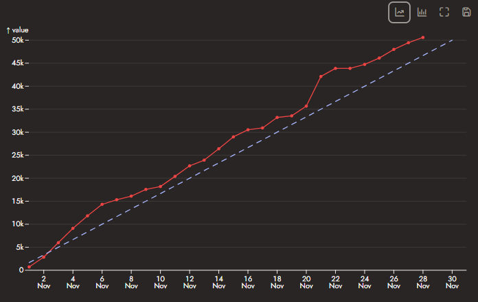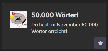 - 50k Wörter für die alten Hasen und ambitionierten Schreiber unter uns (die dann beim Erreichen des Ziels den Titel „Phönix“ erhalten würden)