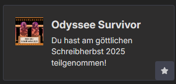 Dieses Jahr verbrachte ich den November fast nur bei den Schreibdrachen, auch wenn ich bei einigen Events des GerNoWriMo bzw. der Schreibhörnchen mitmachte, wo ein Odysee-Event stattfand. Dieses hat mich nicht ganz so motiviert wie das Drachen! Drachen! – Event letztes Jahr, was jedoch wohl an mir lag, die ständig vergessen hat sich die Herausforderungen anzusehen. Wenn ich es dann mal tat, waren es leider öfters Aufgaben, die mir nicht zusagten…